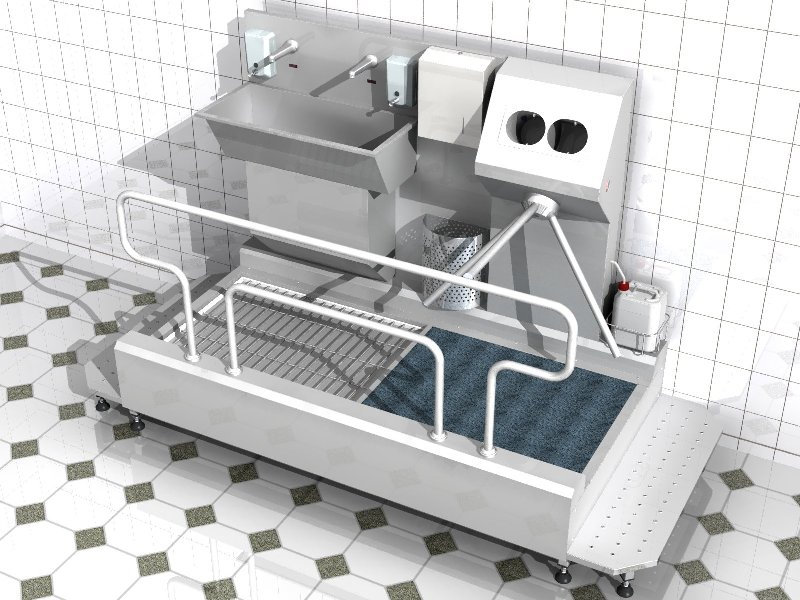 Zemindeki dezenfekte havuzu ayakkabıların alt ve yan yüzeylerine etki eder.